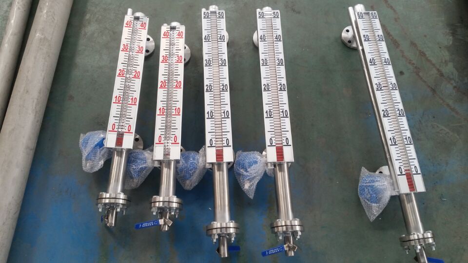 四、磁翻板液位计应用连通管原理,保证被测容器与测量管体间的液位相等,当测量管中的浮子随被测液位等量变化,浮子中的磁性体与显示板上显示色柱中的磁性体作用,使色柱翻转,白色表示无液,红色表示为有液,以达到就地显示液位的数值。
